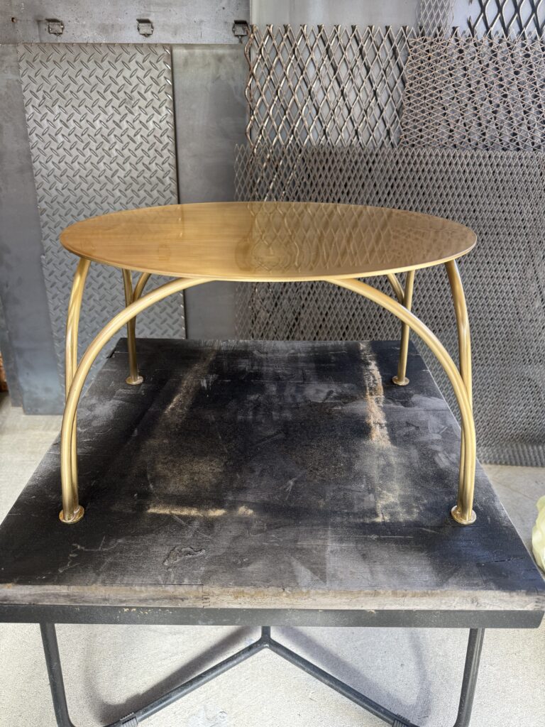 上品な光沢と温かみを持つ真鍮素材を使用し、曲線美が際立つラウンド型テーブルを製作しました。脚部の接合には、一般的な溶接とは異なる銀ロー付けという高度な技法を採用。母材を溶かさずに金属同士を接合するため、繊細な温度管理と熟練した手仕事が求められます。